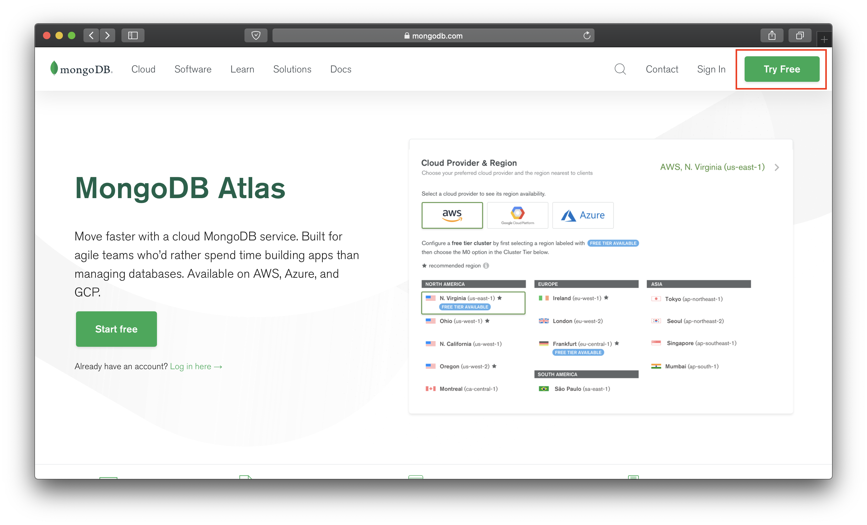 進到 MongoDB Atlas 官網 後,按下圖右上角的 Try Free 註冊帳號。
